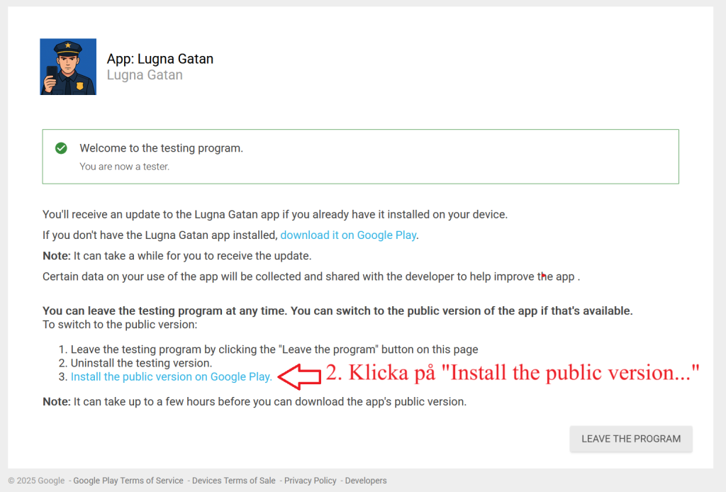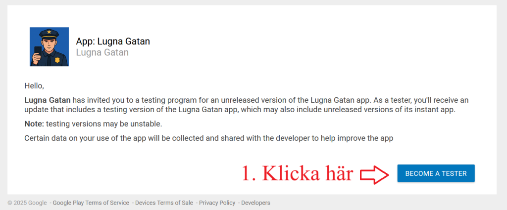 Obs: Din Google Play mailadress måste vara godkänd som testare.